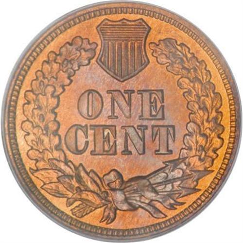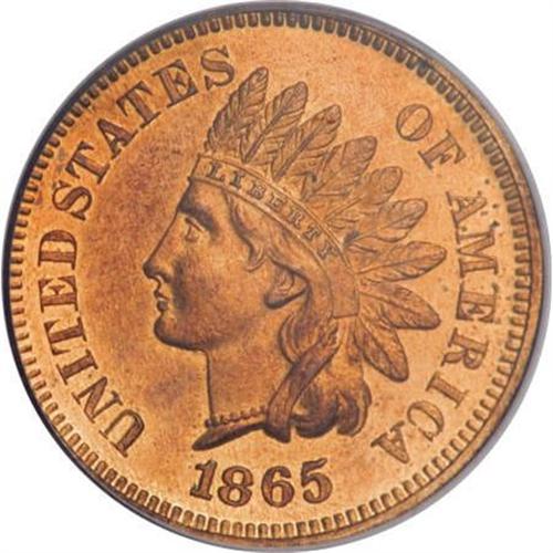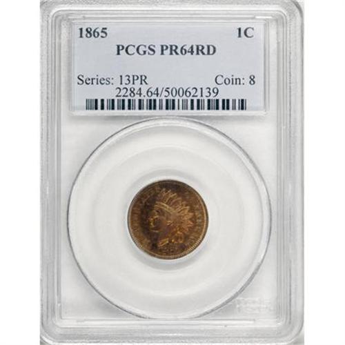 <B>1865 1C PR64 Red PCGS.</B></I> Plain 5. Snow-PR2. A pleasing coin for the grade with strong mint red color and minimal signs of age. We note a few lint marks (as struck) on and near the A of STATES, and another very small one near Liberty's nose. Faint specks can be seen when examined under a strong light. There is a very small die lump on Liberty's neck just touching the ribbon, something quite unusual for a proof coin. Population: 14 in 64 Red, 9 finer (10/07). <BR><BR><B>Coin Engraver:</B> James B. Longacre<BR><BR><b>Shipping:</b> Coins & Currency (<a target="_blank" href="http://www.heritageauctions.com/common/shipping.php">view shipping information</a>)