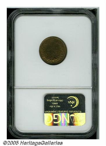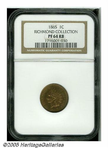 <B>1865<1C> PR64 Red and Brown NGC.</B></I> Ex: Richmond Collection. Plain 5. A boldly struck near-Gem dominated by orange-gold color on the obverse. The field near the denomination has deeper lilac color. A spot is east of the E in ONE. Population: 32 in 64, 36 finer (5/05).