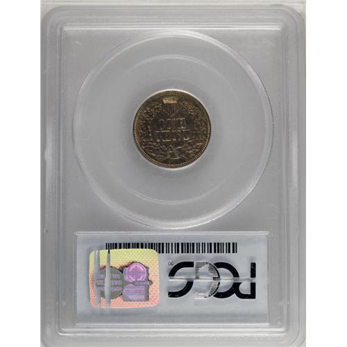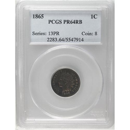 <B>1865<1C> PR64 Red and Brown PCGS.</B></I> Plain 5. This intricately struck specimen is fire-red and gold with peripheral rose splashes and distributed minor carbon. A couple of nearly imperceptible hair-thin marks are noted on the reverse exergue.