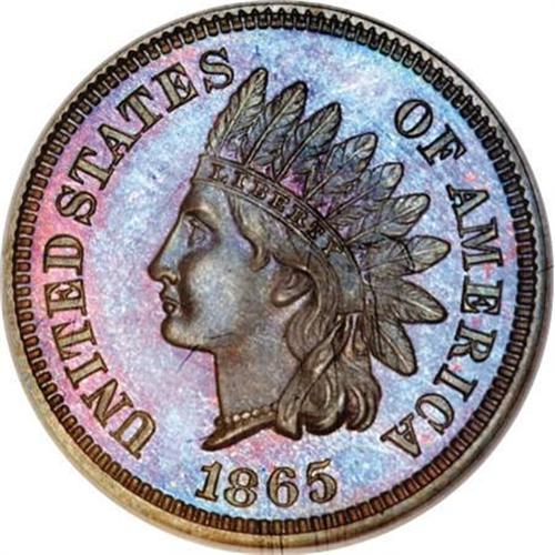 <B>1865 1C PR65 Red and Brown Cameo NGC.</B></I> Plain 5. This needle-sharp Gem displays deep cherry-red and powder-blue iridescence. The surfaces appear flawless when rotated beneath a loupe and a light. Proofs from this era are much scarcer than those from late in the Indian cent series. Just 500+ pieces were struck.<BR><BR><B>Coin Engraver:</B> James B. Longacre<BR><BR><b>Shipping:</b> Coins & Currency (<a target="_blank" href="http://www.heritageauctions.com/common/shipping.php">view shipping information</a>)