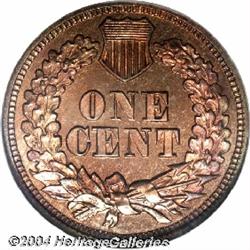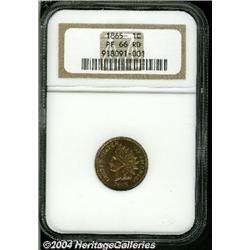 <B>1865<1C> PR66 Red NGC.</B></I> Very scarce as a Gem and with full red color. This coin is not technically a full red piece on the obverse, but it is completely original and untampered. Many of the planchets for proofs from this year have tin and zinc that was not mixed well in the alloy. Because of the volatility of these metals, the planchets will not hold the original red color of the coin for very long. On this piece, the obverse has a lovely mixture of lime-green and red coloration, while the reverse is almost completely cherry-red. An interesting piece and one that the advanced collector will surely appreciate. Population: 1 in 66, 0 finer (9/04). <BR><BR><B>Important notice:</B> Heritage usually auctions material at the rate of 200-250 lots per hour. On some occasions eBay Live bid software or the Internet may not be able to keep up with the pace of the auction. We recommend placing a realistic absentee bid now as insurance to avoid disappointment. Occasionally the auctioneer may eliminate or reject an eBay Live bid, and the auctioneer may also reopen a lot after the close of the eBay live bidding (usually because we missed an audience bid), and may reject your bid even if it shows you as the winning bidder. By bidding via eBay Live, you agree that Heritage may award the lot to another bidder at its sole discretion under the circumstances described above or any other reasonable circumstances. Since eBay bids are not shown to us until we open the lot on the floor, we treat those bids just like floor bids. In most cases the floor responds before the eBay bid is presented to us, due to Internet lag time, so for consistency we have made it a policy that floor bids are always considered first over tie eBay live bids. Also please note that all Heritage lots purchased through eBay Live carry a 20% Buyer's Premium. Please make sure you read the Terms and Conditions before you bid.