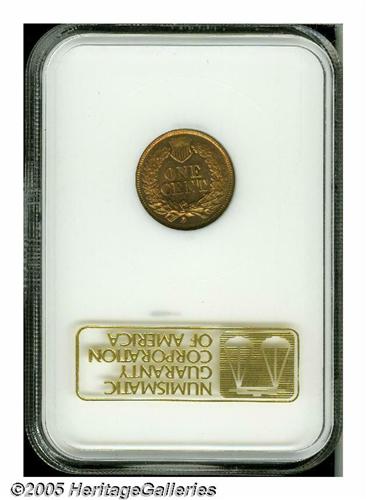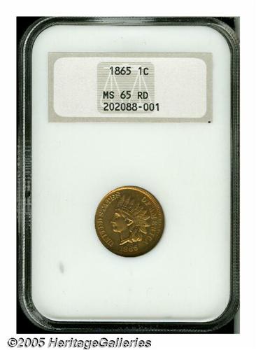 <B>1865<1C> Plain 5 MS65 Red NGC.</B></I> A bright yellow-gold Gem with an occasional hint of rich peach color. The highly lustrous and unmarked surfaces provide no noticeable carbon. Specialists should not that the obverse has a cud at 7 o'clock. The strike is sharp aside from the lower obverse and upper reverse borders.