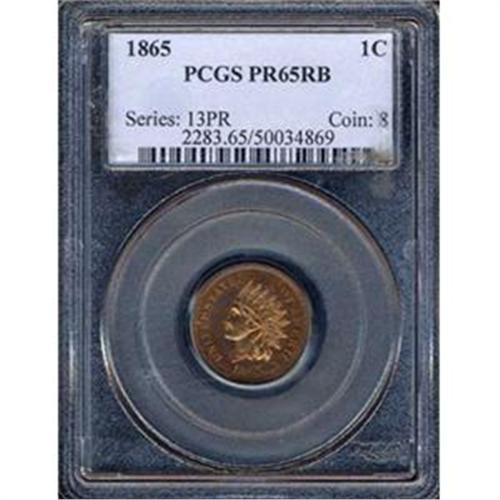 1865 is notorious for having low percentage of red. Many of the planchets used for the proofs were on streaky planchets. When the alloys of tin and inc are not mixed well into the copper, pockets of alloy remain in the French-bronze ingot. As the ingot is rolled out, these pockets get elongated and eventually turn into streaks on the finished planchets. Tin and Zinc are very volatile and will not hold the original color of the coin. The few 1865's that remain in bright red or red and brown are presumably from a higher quality melt, and are very rare and desirable because of this.