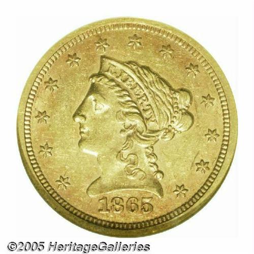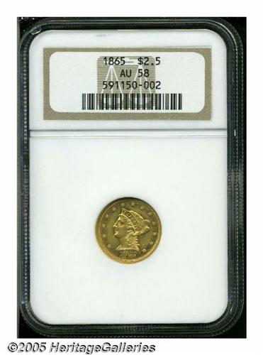 <B>1865<$2 1/2> AU58 NGC.</B></I> The 1865 is one of the outstanding rarities in the Coronet series of Quarter Eagles, both from the vantage point of total numbers available and of average condition. Only 1,520 business strikes were originally produced and Breen believed them more elusive than the proofs of this date, of which only 25 were minted. We wouldn't go quite that far in our assessment, but the 1865 is nonetheless an undeniably rare coin. This is a mildly prooflike example, as expected for the brief mintage, and is accented in pale violet and reddish hues. Quite possibly unsurpassable quality for this extremely challenging Quarter Eagle issue. Population: 8 in 58, 0 finer (5/05).