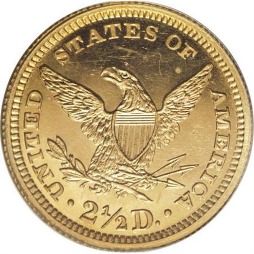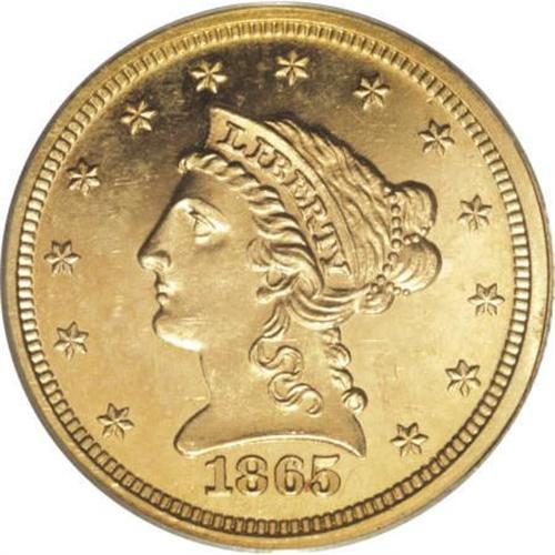 <B>1865 $2 1/2 PR63 Deep Cameo PCGS.</B></I> A few tiny contact marks and faint abrasions are visible in the fields of this pleasing proof. Exceptional contrast on both sides with rich orange color create a high degree of aesthetic appeal. Only 25 proof quarter eagles were coined, and probably just half survive today.<BR> The Smithsonian Institution has a Proof 64 Deep Cameo example that was coined in a medal turn alignment, opposite of the standard coin turn. Most auction catalogs do not indicate the die alignment, although this example is coin turn, thus both alignments were used for proofs.<BR> In addition to the Smithsonian coin and this specimen, others known include the Bass, Trompeter, Eliasberg, Garrett, and Norweb specimens.<BR><BR><b>Shipping:</b> Coins & Currency (<a target="_blank" href="http://www.heritageauctions.com/common/shipping.php">view shipping information</a>)