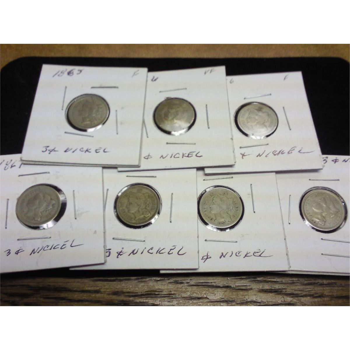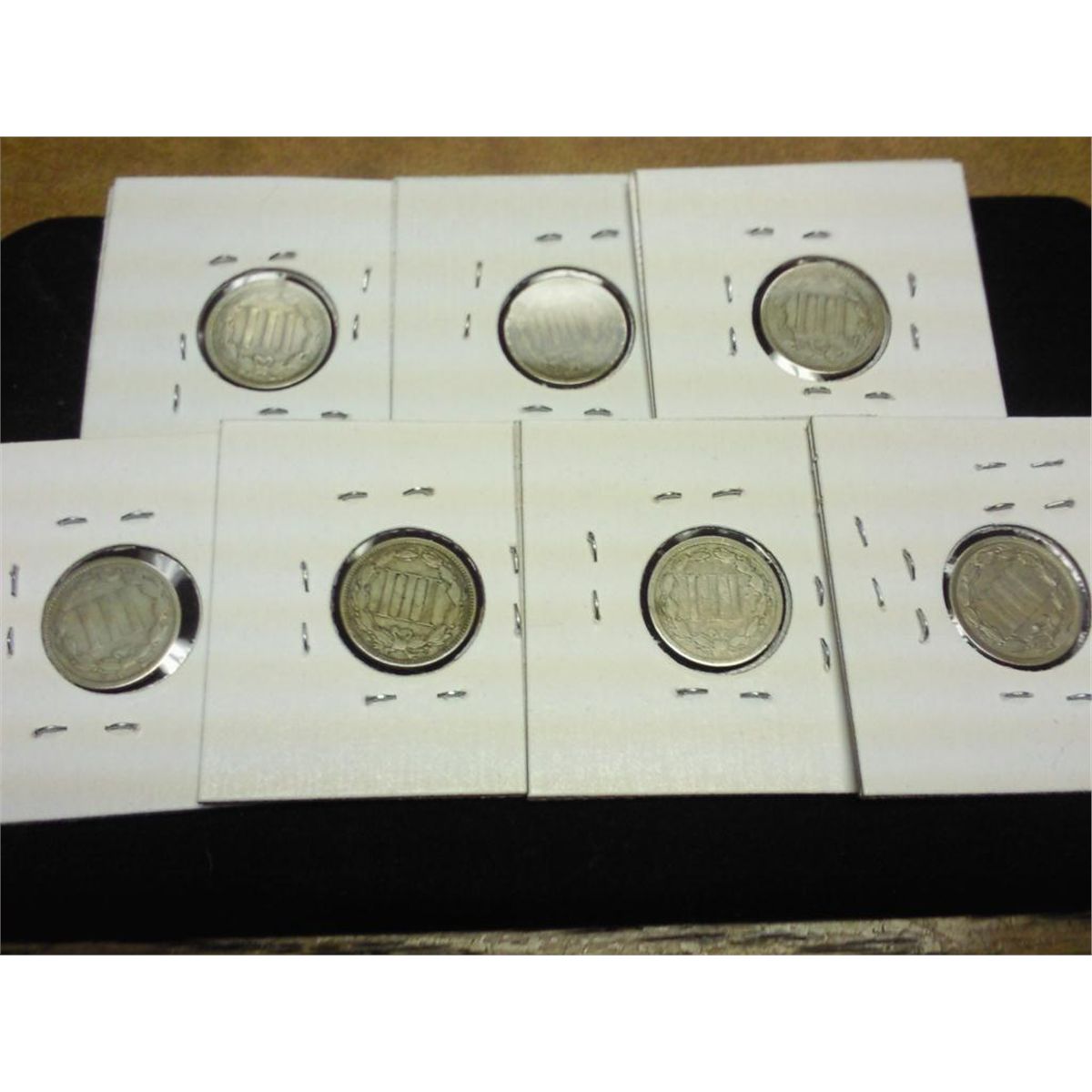 1865,2-1866,1867,1868,1872 & 81 THREE CENT PIECES