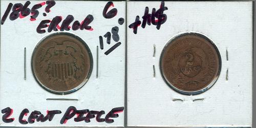 1865? 2 Cent Error. G detail. 178* rotation. (5 worn off).