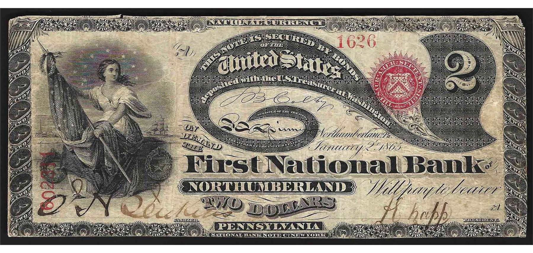 One 1865 $2 Lazy Duece First National Bank Note National Currency.