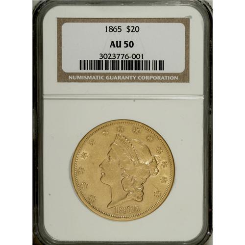 <B>1865 $20 AU50 NGC.</B></I> MPD-002. The tops of two date digits are obvious within the dentils beneath the 65 in the date. A band of bright luster individually outlines each obverse star, while the reverse retains more than half its initial luster.<BR><BR><b>Shipping:</b> Coins & Currency (<a target="_blank" href="http://www.heritageauctions.com/common/shipping.php">view shipping information</a>)