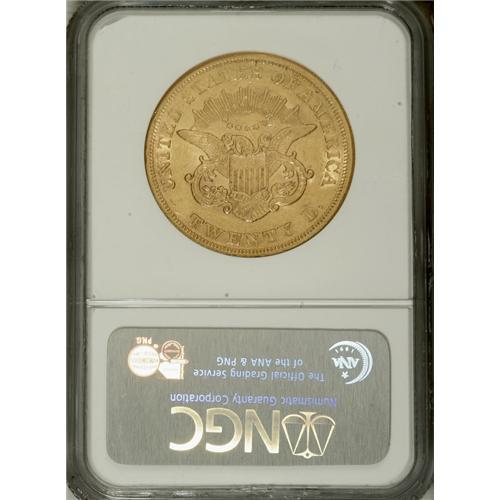 1865 $20 AU50 NGC. MPD-002. The tops of two date digit