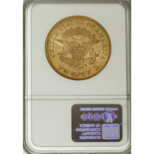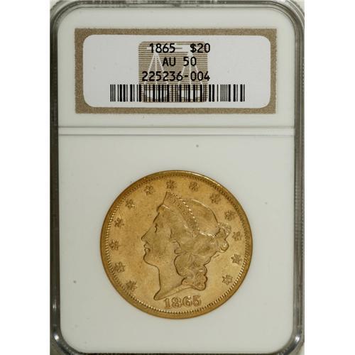 <B>1865 $20 AU50 NGC.</B></I> Portions of three date digits are misplaced within the denticles. Lustrous for the grade, and only moderately abraded. Recovery of the <I>S.S. Republic,</B></I> which sank in 1865, has made this late Type One issue affordable in AU.<BR><BR><b>Shipping:</b> Coins & Currency (<a target="_blank" href="http://www.heritageauctions.com/common/shipping.php">view shipping information</a>)