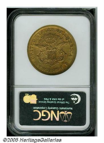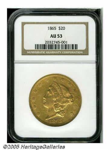 <B>1865<$20> AU53 NGC.</B></I> A scarce Type One that is seldom seen in AU or better condition. The color is a reddish-gold. This is a very nice coin for the grade that is adequately struck, though some of Liberty's hair reveals minor softness. The surfaces do not show the heavy abrasions that usually accompany Type Ones in circulated grades. A small rim bruise at 8 o'clock on the obverse is mentioned for accuracy.