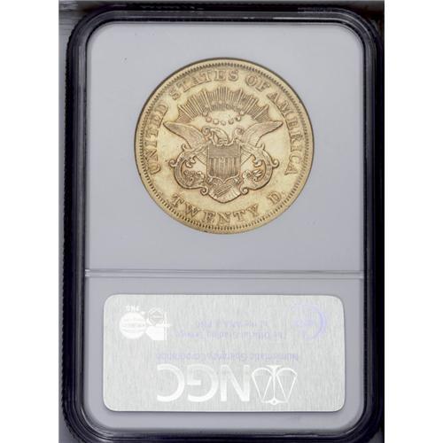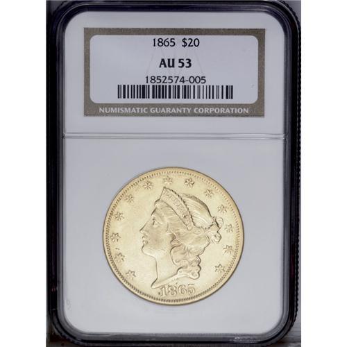 1865 $20 AU53 NGC. The expected handling marks are pre