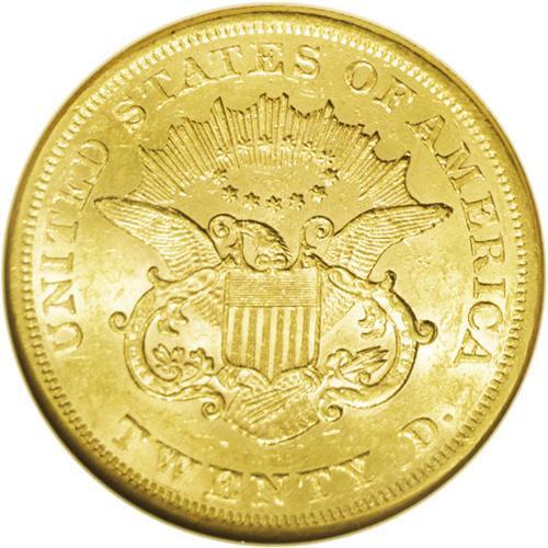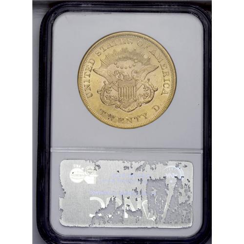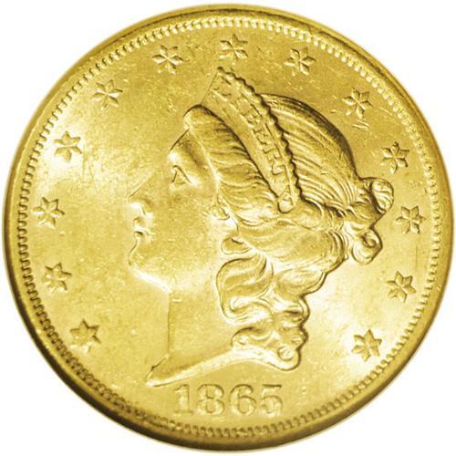 <B>1865<$20> AU58 NGC.</B></I> Before examples were recovered from the <I>S.S. Republic</B></I> treasure, this piece would have ranked among the finest pieces that have survived over the years. Of course, the treasure yielded over 300 AU and Mint State coins, so now this issue is one of the most common Type One double eagles. This specimen has nearly full luster and lightly abraded but attractive surfaces. It has bright yellow-gold color with subtle traces of pink toning.