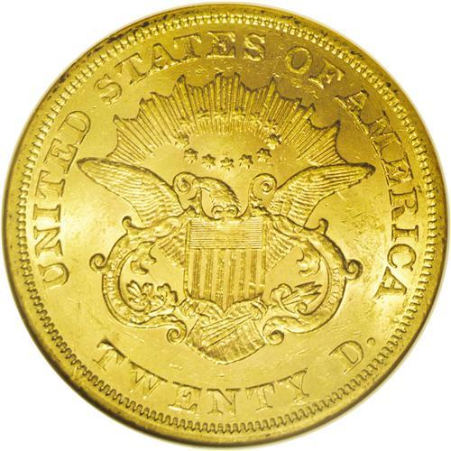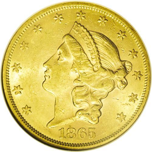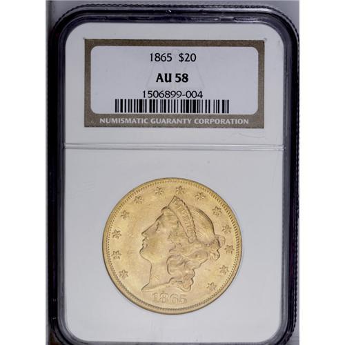 <B>1865<$20> AU58 NGC.</B></I> Considered common in lower grades but scarce in AU or higher, are rare in Mint State. This example boasts pretty orange-gold, still-lustrous surfaces with a few moderate, grade-consistent abrasions. Light clash marks show on the reverse.<BR><I>From The Derrick Snider Collection.</B></I>