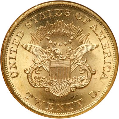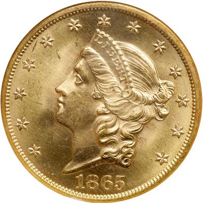 1865 $20 Liberty. NGC graded MS-65. A blazing gem both well struck and untoned. Talk about a truly out of this world coin! We are pleased to report richly frosted luster on the reverse with oceans more satiny texture on the obverse, creating a duality of pristine pride. There are really no areas of vexing weak detail on either side, just the opposite in fact. The coin is sharp as a knife blade with crisp details in the main devices and legends. All stars full. As to the color, it is primarily bright reddish-gold in hue and similar to a few others from the S.S. Republic shipwreck that have been carefully "conserved" by the salvers. Both sides are deservedly free of blemishes for a Type 1 Liberty $20 in a Mint State 65 holder, a lot of high-class preservation. All things considered, someone would be hard pressed to imagine a more attractive 1865 from this historic shipwreck in the rare coin marketplace. Pop 3; none finer at either service. (PCGS # 8943).