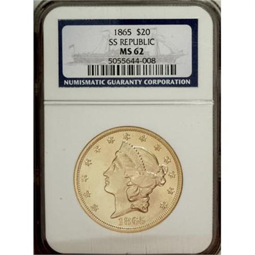 <B>1865 $20 MS62 NGC.</B></I> Ex: <I>S.S. Republic</B></I>. Jeff Garrett and Ron Guth, in their <I>Encyclopedia of U.S. Gold Coins</B></I>, write: "Before the discovery of the <I>S.S. Republic</B></I>, the 1865 double eagle was generally only seen in Very Fine or Extremely Fine condition. The best Harry W. Bass Jr. could acquire in 30-plus years of collecting was About Uncirculated. The Smithsonian currently lacks an example. The rarity changed when the treasure of the <I>S.S. Republic</B></I> was brought to light. The 1865 double eagle was the most plentiful date found, with 320 pieces in grades ranging from AU to MS65. The luster on the coins is superb, and they are nearly in the same condition as the day they left the Philadelphia Mint."<BR> The bright, lustrous surfaces on this MS62 <I>S.S. Republic </B></I>example yield an attractive brassy-gold color, along with sharply defined design elements. The surfaces are very well preserved, except for a few small contact marks on Liberty's cheek and light luster grazes in the left obverse field. <BR><BR><B>Coin Engraver:</B> James B. Longacre<BR><BR><b>Shipping:</b> Coins & Currency (<a target="_blank" href="http://www.heritageauctions.com/common/shipping.php">view shipping information</a>\)