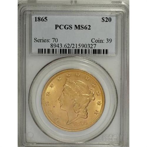 <B>1865 $20 MS62 PCGS.</B></I> The 1 in the date is triple punched, and has traces of earlier punches both above and below the prominent 1. This satiny representative is uncommonly well struck, even on the often indistinct hair curls. A reeding mark in front of Liberty's nose and a shallow abrasion to the right of stars 2 and 3 keep this attractive example from an otherwise deserved Select rating. While the discovery of numerous 1865-dated double eagles aboard several shipwrecks has increased the issue's overall availability in Mint State, most of those coins, pedigreed to the <I>S.S. Republic</B></I>, were certified by NGC. The PCGS Registry enthusiast should give the present coin particularly close attention. Population: 8 in 62, 5 finer (2/08).<BR><BR><B>Coin Engraver:</B> James B. Longacre<BR><BR><b>Shipping:</b> Coins & Currency (<a target="_blank" href="http://www.heritageauctions.com/common/shipping.php">view shipping information</a>)