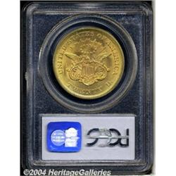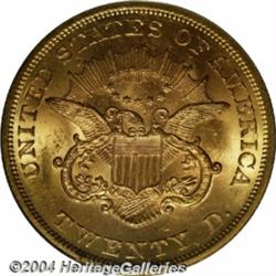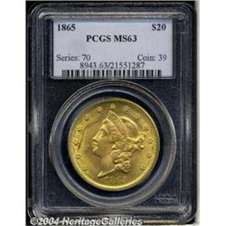 <B>1865<$20> MS63 PCGS.</B></I> A sharply struck Civil War Twenty with pleasing cartwheel luster and a very clean portrait. The reverse is also well preserved, and while the obverse field has a few luster grazes that are consistent with the grade, there are no distracting bagmarks. As is the rule for Double Eagles of this era, lightly circulated survivors can be found without substantial difficulty, but true Uncirculated pieces are nearly unobtainable. The 18 in the date is noticeably repunched on the present piece, although not as dramatically as on the 1865 inverted date S-mint Eagle. Population: 3 in 63, none finer (3/04). <BR><BR><B>Important notice:</B> Heritage usually auctions material at the rate of 200-250 lots per hour. On some occasions eBay Live bid software or the Internet may not be able to keep up with the pace of the auction. We recommend placing a realistic absentee bid now as insurance to avoid disappointment. Occasionally the auctioneer may eliminate or reject an eBay Live bid, and the auctioneer may also reopen a lot after the close of the eBay live bidding (usually because we missed an audience bid), and may reject your bid even if it shows you as the winning bidder. By bidding via eBay Live, you agree that Heritage may award the lot to another bidder at its sole discretion under the circumstances described above or any other reasonable circumstances. Since eBay bids are not shown to us until we open the lot on the floor, we treat those bids just like floor bids. In most cases the floor responds before the eBay bid is presented to us, due to Internet lag time, so for consistency we have made it a policy that floor bids are always considered first over tie eBay live bids. Also please note that all Heritage lots purchased through eBay Live carry a 20% Buyer's Premium. Please make sure you read the Terms and Conditions before you bid. </span></font></tr></table></td></tr></table>