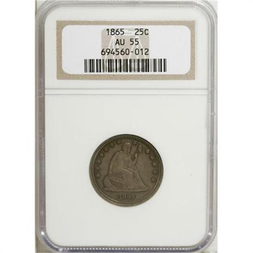 <B>1865 25C AU55 NGC.</B></I> NGC Census: (2/21). PCGS Population (2/26). Mintage: 58,800. Numismedia Wsl. Price for NGC/PCGS coin in AU55: $415. (#5461)<BR><BR><B>Coin Engraver:</B> Christian Gobrecht<BR><BR><b>Shipping:</b> Coins & Currency (<a target="_blank" href="http://www.heritageauctions.com/common/shipping.php">view shipping information</a>\)
