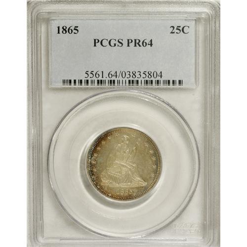 <B>1865 25C PR64 PCGS.</B></I> The hazy gold and orange patina that covers most of this Choice proof deepens at the rims. The lightly hairlined surfaces exhibit considerable reflectivity beneath the toning. One of only 500 proofs struck for this final Civil War year. Population: 34 in 64, 18 finer (3/07).<BR><BR><b>Shipping:</b> Coins & Currency (<a target="_blank" href="http://www.heritageauctions.com/common/shipping.php">view shipping information</a>)