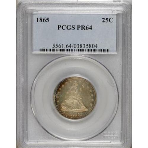 <B>1865 25C PR64 PCGS.</B></I> The hazy gold and orange patina that covers most of this Choice proof deepens at the rims. The lightly hairlined surfaces exhibit considerable reflectivity beneath the toning. An enticing representative of this mid-date Seated issue. Population: 34 in 64, 18 finer (6/07).<BR><BR><B>Coin Engraver:</B> Christian Gobrecht<BR><BR><b>Shipping:</b> Coins & Currency (<a target="_blank" href="http://www.heritageauctions.com/common/shipping.php">view shipping information</a>\)
