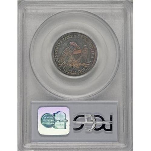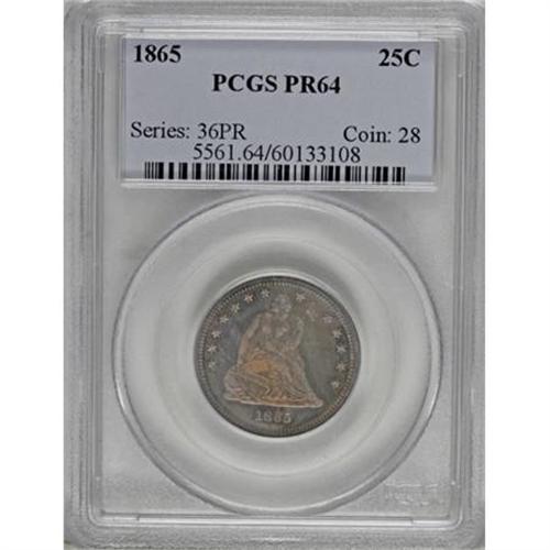 <B>1865 25C PR64 PCGS.</B></I> Both sides of this near-Gem proof display pronounced field-motif contrast when the coin is tilted slightly under a light source. Orange-gold patination dominates, joined by splashes of sky-blue and violet. Crisply struck, with just a few minor handling marks that preclude full <BR>Gem status. Population: 36 in 64, 18 finer (8/07).<BR><BR><B>Coin Engraver:</B> Christian Gobrecht<BR><BR><b>Shipping:</b> Coins & Currency (<a target="_blank" href="http://www.heritageauctions.com/common/shipping.php">view shipping information</a>)