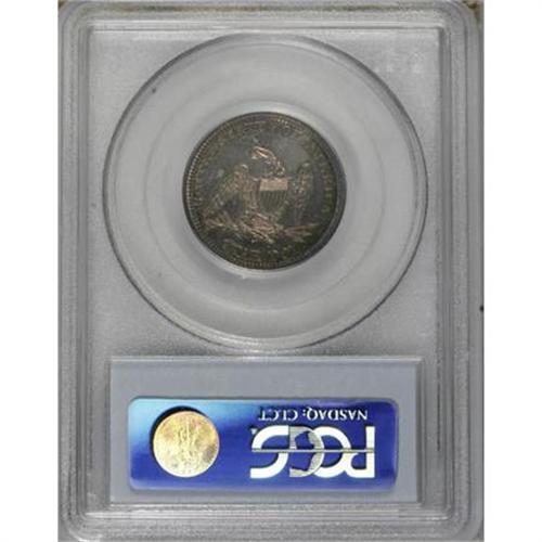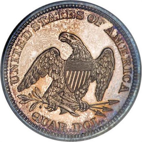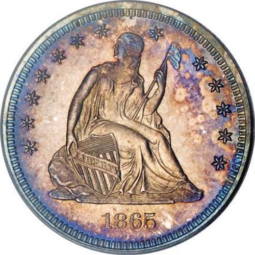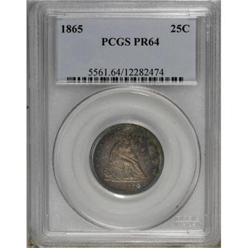 <B>1865 25C PR64 PCGS.</B></I> Although insufficient for a Cameo designation, considerable field-device contrast is apparent on both sides of this moderately toned near-Gem, which offers iridescent steel-blue peripheral toning that complements the centers, shaded in pinkish-gold. A single tick is noted on Liberty's cheek, but otherwise the surfaces are quite clean. The mintage for this last-year Civil War issue was 500 pieces.<BR><BR><B>Coin Engraver:</B> Christian Gobrecht<BR><BR><b>Shipping:</b> Coins & Currency (<a target="_blank" href="http://www.heritageauctions.com/common/shipping.php">view shipping information</a>)