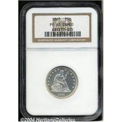 <B>1865<25C> PR65 Cameo NGC.</B></I> Only 500 proof Quarters were struck in 1865 and few can rival the sheer aesthetic appeal of this splendid coin. Brilliant throughout, the devices are snow-white and are set against the unfathomable depth of mirrored reflectivity seen in the fields. The lovely surfaces are only kept from an even higher grade by a hairline that runs from star 9 to the rim over Liberty's head. Population: 2 in 65, 8 finer (4/04). <BR><BR><B>Important notice:</B> Heritage usually auctions material at the rate of 200-250 lots per hour. On some occasions eBay Live bid software or the Internet may not be able to keep up with the pace of the auction. We recommend placing a realistic absentee bid now as insurance to avoid disappointment. Occasionally the auctioneer may eliminate or reject an eBay Live bid, and the auctioneer may also reopen a lot after the close of the eBay live bidding (usually because we missed an audience bid), and may reject your bid even if it shows you as the winning bidder. By bidding via eBay Live, you agree that Heritage may award the lot to another bidder at its sole discretion under the circumstances described above or any other reasonable circumstances. Since eBay bids are not shown to us until we open the lot on the floor, we treat those bids just like floor bids. In most cases the floor responds before the eBay bid is presented to us, due to Internet lag time, so for consistency we have made it a policy that floor bids are always considered first over tie eBay live bids. Also please note that all Heritage lots purchased through eBay Live carry a 20% Buyer's Premium. Please make sure you read the Terms and Conditions before you bid.