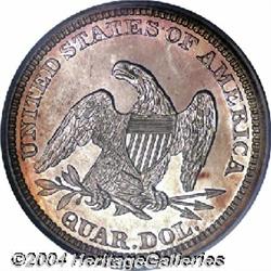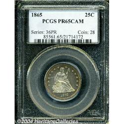<B>1865<25C> PR65 Cameo PCGS.</B></I> This is a Gem Cameo Proof and one of the finest currently available in the market place. This example has a normal, centered date. Breen speculated that other Proofs, with the date slanting up to the right, might have been restrikes produced after 1865. This example has deeply mirrored fields, sharply defined and lustrous devices, and peripheral pale gold toning. Population: 4 in 65, 2 finer (9/04). <BR><BR><B>Important notice:</B> Heritage usually auctions material at the rate of 200-250 lots per hour. On some occasions eBay Live bid software or the Internet may not be able to keep up with the pace of the auction. We recommend placing a realistic absentee bid now as insurance to avoid disappointment. Occasionally the auctioneer may eliminate or reject an eBay Live bid, and the auctioneer may also reopen a lot after the close of the eBay live bidding (usually because we missed an audience bid), and may reject your bid even if it shows you as the winning bidder. By bidding via eBay Live, you agree that Heritage may award the lot to another bidder at its sole discretion under the circumstances described above or any other reasonable circumstances. Since eBay bids are not shown to us until we open the lot on the floor, we treat those bids just like floor bids. In most cases the floor responds before the eBay bid is presented to us, due to Internet lag time, so for consistency we have made it a policy that floor bids are always considered first over tie eBay live bids. Also please note that all Heritage lots purchased through eBay Live carry a 20% Buyer's Premium. Please make sure you read the Terms and Conditions before you bid.