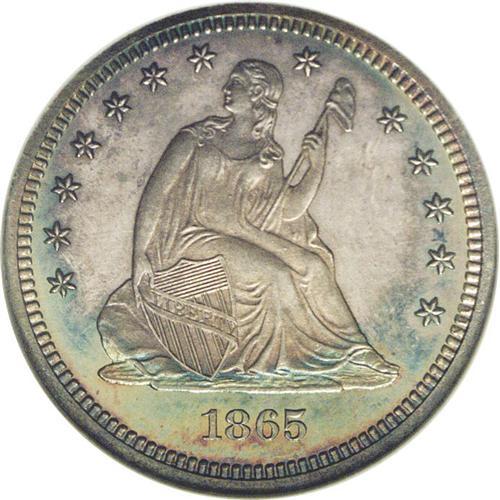 1865 25C PR65 NGC. Luminous powder-blue, lemon-lime, a 1865