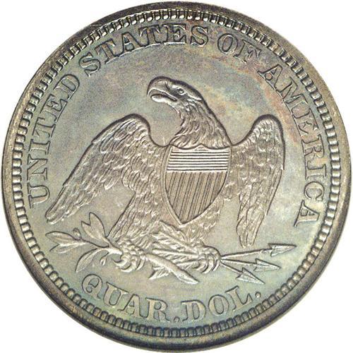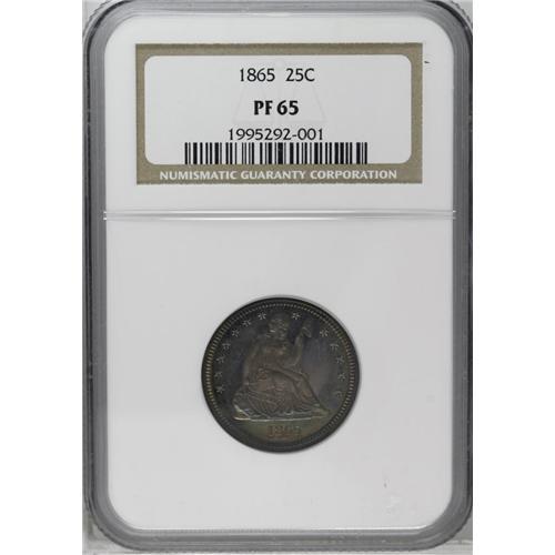 <B>1865<25C> PR65 NGC.</B></I> Luminous powder-blue, lemon-lime, and rose hues grace this flashy and fully struck Gem, an undisturbed and beautiful example. Just 500 proofs were struck for this final Civil War date; the related business strike production was less than 60,000 pieces. QUAR. DOL. is lightly die doubled. Census: 17 in 65, 14 finer (6/06).