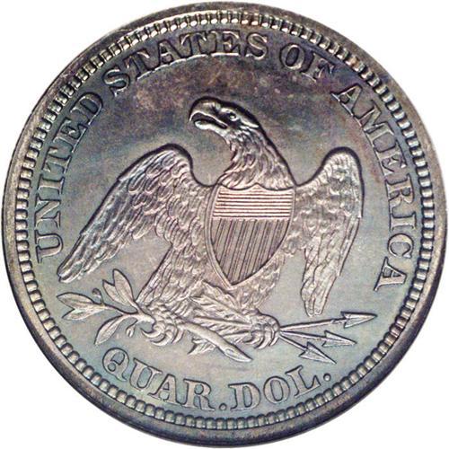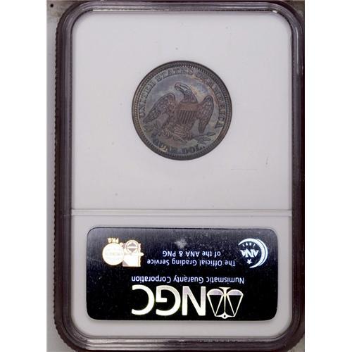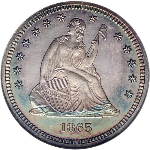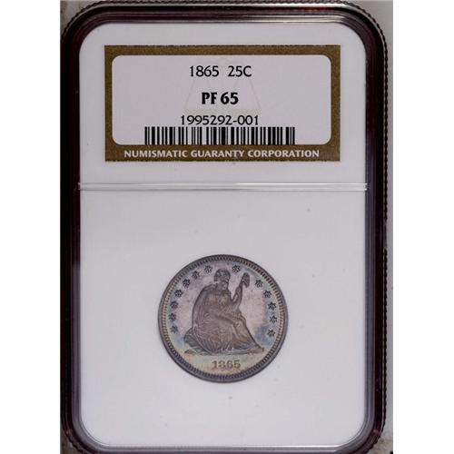 <B>1865<25C> PR65 NGC.</B></I> Luminous powder-blue, lemon-lime, and rose hues grace this flashy and fully struck Gem. Both undisturbed and beautiful. Just 500 proofs were struck for this final Civil War date, and the related business strike production was less than 60,000 pieces. QUAR DOL is lightly die doubled. Census: 18 in 65, 14 finer (2/06).