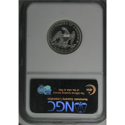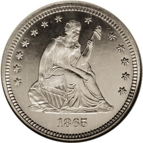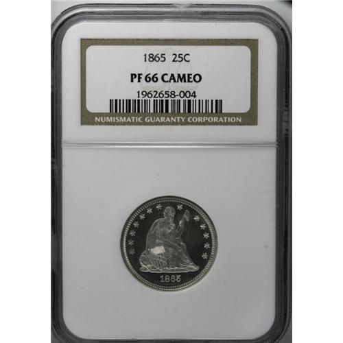 <B>1865<25C> PR66 Cameo NGC.</B></I> All of the design elements are crisply and completely defined on both sides of this beautiful Premium Gem proof. The richly frosted devices seem to be suspended over watery, jet-black fields. Exquisitely preserved and free of even minor detractions, this is a technically and visually superior specimen. Census: 8 in 66 Cameo, 5 finer (8/06).