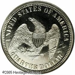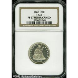 <B>1865 25C Quarter Dollar, Judd-423, Pollock-495, Low R.7, PR67 Deep Cameo NGC.</B></I> It is really a shame that Anthony Paquet didn't do more work for the Mint, for his artistry is superb. He was fond of delicate lettering and design elements that gave a distinctive look to our coinage. The obverse design is the standard Liberty Seated die that was already in production, while the reverse design by Paquet was used on various quarter dollar patterns of 1858, 1859, and 1864 in addition to these 1865-dated issues. This pattern variety appears to be a solid Rarity-7 issue, and this Superb Gem with its high degree of cameo contrast is almost certainly one of the finest known examples. It is fully brilliant with deeply mirrored fields and highly lustrous devices. There do not appear to be any blemishes to use for pedigree purposes. Lot:9837