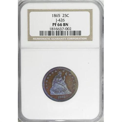 <B>1865 25C Quarter Dollar, Judd-426, Pollock-498, Low R.7, PR66 Brown NGC.</B></I> Similar to the adopted design of 1866, the motto IN GOD WE TRUST has been placed on a scroll in the reverse field above the eagle. Struck in copper with a reeded edge. Chocolate-brown toning transforms to electric-blue and violet-red when this wonderfully preserved example is rotated beneath a light. A vibrant Gem worthy of a close look and a strong bid.<BR><BR><b>Shipping:</b> Coins & Currency (<a target="_blank" href="http://www.heritageauctions.com/common/shipping.php">view shipping information</a>)