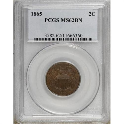 <B>1865 2C MS62 Brown PCGS.</B></I> PCGS Population (56/350). NGC Census: (98/597). Mintage: 13,640,000. Numismedia Wsl. Price for NGC/PCGS coin in MS62: $100. (#3582)<BR><BR><B>Coin Engraver:</B> James B. Longacre<BR><BR><b>Shipping:</b> Coins & Currency (<a target="_blank" href="http://www.heritageauctions.com/common/shipping.php">view shipping information</a>)