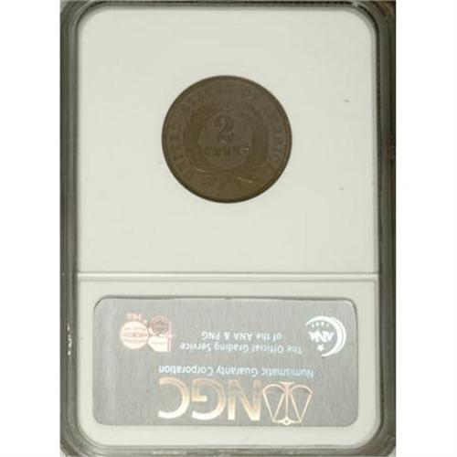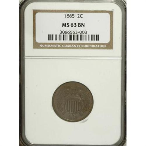 <B>1865 2C MS63 Brown NGC.</B></I> NGC Census: (146/447). PCGS Population (172/173). Mintage: 13,640,000. Numismedia Wsl. Price for NGC/PCGS coin in MS63: $130. (#3582)<BR><BR><B>Coin Engraver:</B> James B. Longacre<BR><BR><b>Shipping:</b> Coins & Currency (<a target="_blank" href="http://www.heritageauctions.com/common/shipping.php">view shipping information</a>)