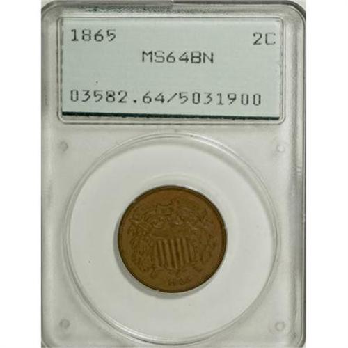 <B>1865 2C MS64 Brown PCGS.</B></I> PCGS Population (141/32). NGC Census: (265/181). Mintage: 13,640,000. Numismedia Wsl. Price for NGC/PCGS coin in MS64: $180. (#3582)<BR><BR><B>Coin Engraver:</B> James B. Longacre<BR><BR><b>Shipping:</b> Coins & Currency (<a target="_blank" href="http://www.heritageauctions.com/common/shipping.php">view shipping information</a>)