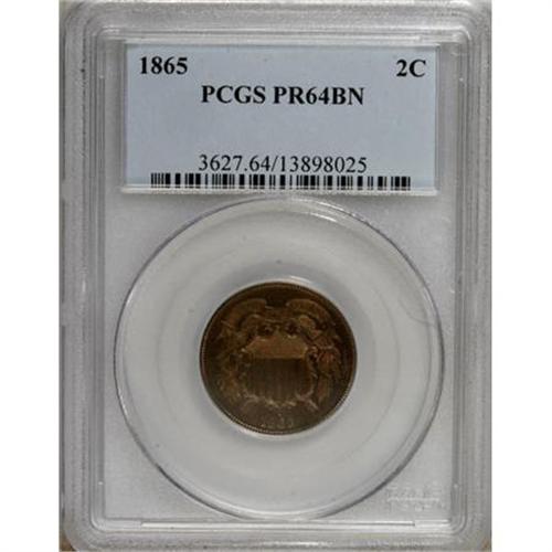<B>1865 2C PR64 Brown PCGS.</B></I> PCGS Population (13/10). NGC Census: (14/23). Mintage: 500. Numismedia Wsl. Price for NGC/PCGS coin in PR64: $440. (#3627)<BR><BR><B>Coin Engraver:</B> James B. Longacre<BR><BR><b>Shipping:</b> Coins & Currency (<a target="_blank" href="http://www.heritageauctions.com/common/shipping.php">view shipping information</a>\)