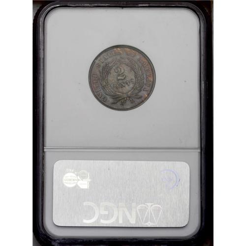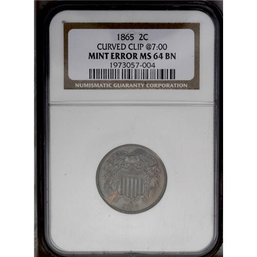 1865 2C --Curved Clip at 7 o''clock--MS64 Brown NGC. Th 1865[2C] Two Cent Piece--Curved Clip at 7 o'