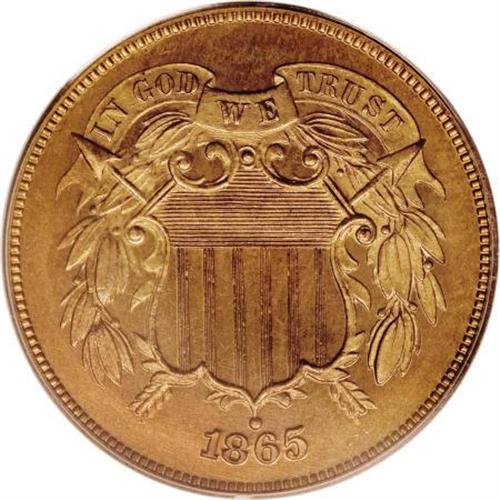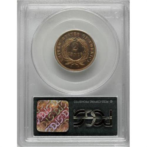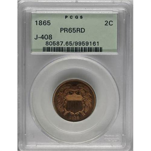 <B>1865 2C Two Cent, Judd-408, Unlisted in Pollock, PR65 Red PCGS.</B></I> Regular die trials issue of the two cent piece. Struck in copper with a plain edge. Undoubtedly delisted by Pollock because of the near impossibility of determining the difference in copper and bronze (the actual coining metal) without metallurgical analysis. This piece has bright orange-red surfaces with no mellowing on either side.<BR><BR><b>Shipping:</b> Coins & Currency (<a target="_blank" href="http://www.heritageauctions.com/common/shipping.php">view shipping information</a>\)