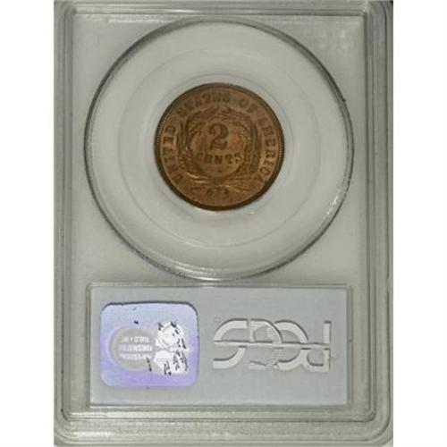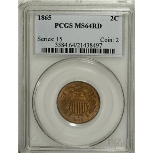 <B>1865 2C MS64 Red PCGS.</B></I> Plain 5. The fields of this red Gem display prooflike tendencies, thereby nicely highlighting the design elements, especially when the coin is tilted slightly under a light source. Impressively struck throughout, further enhancing the overall eye appeal. The few grade-defining flecks scattered about do not detract.<BR><BR><B>Coin Engraver:</B> James B. Longacre<BR><BR><b>Shipping:</b> Coins & Currency (<a target="_blank" href="http://www.heritageauctions.com/common/shipping.php">view shipping information</a>)