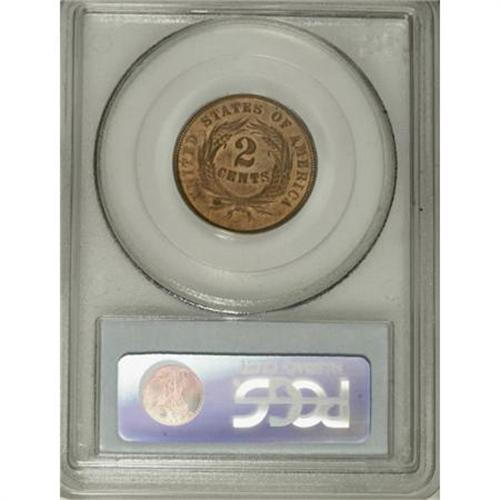 <B>1865 2C MS64 Red PCGS.</B></I> Fancy 5. Somewhat weakly defined along the left sides of both obverse and reverse, this near-Gem two cent piece exhibits full mint red color and nicely preserved surfaces that are nearly blemish-free. A few scattered flyspecks appear on each side. A good choice for either a date or type set.<BR><BR><B>Coin Engraver:</B> James B. Longacre<BR><BR><b>Shipping:</b> Coins & Currency (<a target="_blank" href="http://www.heritageauctions.com/common/shipping.php">view shipping information</a>)