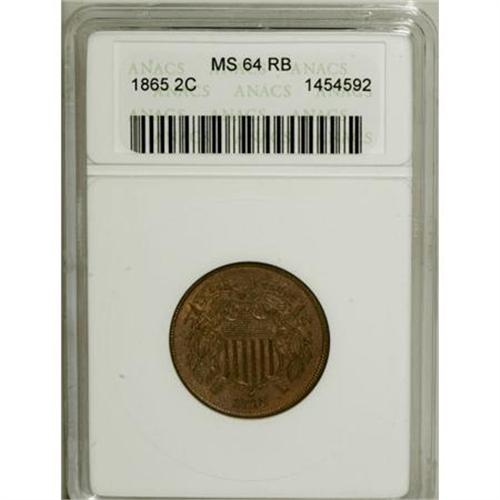 <B>1865 2C MS64 Red and Brown ANACS.</B></I> NGC Census: (292/365). PCGS Population (518/226). Mintage: 13,640,000. Numismedia Wsl. Price for NGC/PCGS coin in MS64: $252. (#3583)<BR><BR><b>Shipping:</b> Coins & Currency (<a target="_blank" href="http://www.heritageauctions.com/common/shipping.php">view shipping information</a>)
