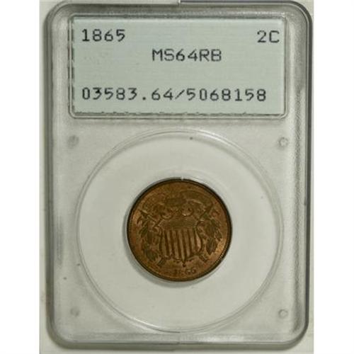 <B>1865 2C MS64 Red and Brown PCGS.</B></I> PCGS Population (518/226). NGC Census: (292/365). Mintage: 13,640,000. Numismedia Wsl. Price for NGC/PCGS coin in MS64: $252. (#3583)<BR><BR><b>Shipping:</b> Coins & Currency (<a target="_blank" href="http://www.heritageauctions.com/common/shipping.php">view shipping information</a>)