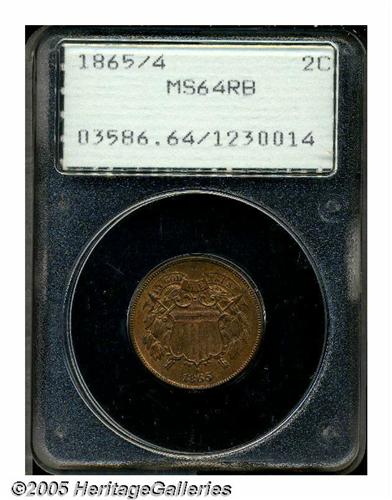 <B>1865<2C> MS64 Red and Brown PCGS.</B></I> Plain 5. A nicely struck near-Gem with apricot and rose hues. Essentially unabraded, a couple of tiny spots prevent a finer grade. Certified in a first generation holder which records the variety as 1865/4, a controversial overdate that PCGS has since delisted.