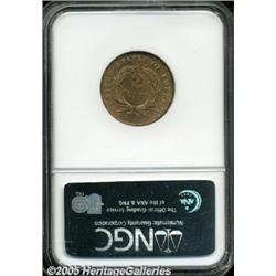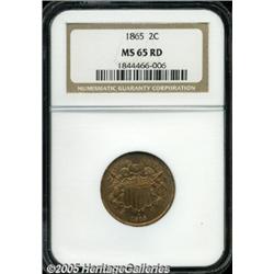 <B>1865 2C MS65 Red NGC.</B></I> Fancy 5. Softly struck with bright, exceedingly frosty mint luster, rich red-orange color, and a few superficial surface blemishes. This flashy Gem would make a great example for type purposes. Population: 87 in 65, 25 finer (2/05).