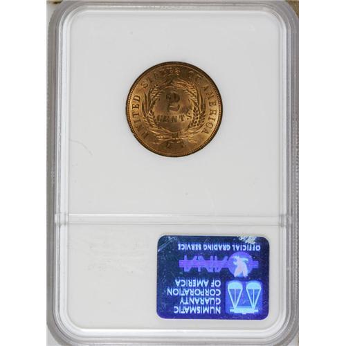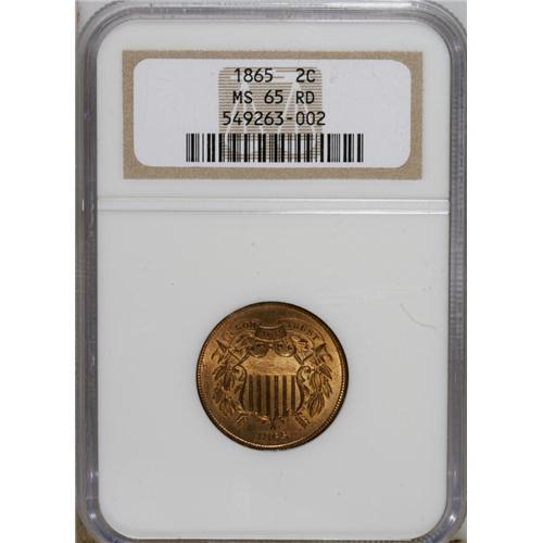 <B>1865 2C MS65 Red NGC.</B></I> Fancy 5. This boldly struck Gem has alternating shades of straw-gold and orange-gray. Marks are essentially absent, and carbon is limited to a few pinpoint flecks along the reverse border.<BR><BR><b>Shipping:</b> Coins & Currency (<a target="_blank" href="http://www.heritageauctions.com/common/shipping.php">view shipping information</a>)