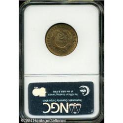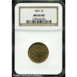 1865 2C MS65 Red NGC. Fancy 5. Well struck aside f <B>1865 2C MS65 Red NGC.</B></I> Fancy 5. Well struck aside from minor softness on the date, this lustrous Gem features rich orange-gold color and is undisturbed by contact. A small spot near the R in AMERICA does not distract. <BR><BR><B>Important notice:</B> Heritage usually auctions material at the rate of 200-250 lots per hour. On some occasions eBay Live bid software or the Internet may not be able to keep up with the pace of the auction. We recommend placing a realistic absentee bid now as insurance to avoid disappointment. Occasionally the auctioneer may eliminate or reject an eBay Live bid, and the auctioneer may also reopen a lot after the close of the eBay live bidding (usually because we missed an audience bid), and may reject your bid even if it shows you as the winning bidder. By bidding via eBay Live, you agree that Heritage may award the lot to another bidder at its sole discretion under the circumstances described above or any other reasonable circumstances. Since eBay bids are not shown to us until we open the lot on the floor, we treat those bids just like floor bids. In most cases the floor responds before the eBay bid is presented to us, due to Internet lag time, so for consistency we have made it a policy that floor bids are always considered first over tie eBay live bids. Also please note that all Heritage lots purchased through eBay Live carry a 20% Buyer's Premium. Please make sure you read the Terms and Conditions before you bid. This lot is being auctioned in conjunction with a live floor auction by Heritage Galleries & Auctioneers. All final auction and invoice information will be supplied by Heritage Galleries & Auctioneers, and all other information should be considered preliminary. Lot:5467